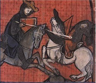 | Kong Balduin d.4. besejrer en muslimsk kriger i slaget ved Montgisard 1177. Fransk manuskript ”Estoire d’Eracles” |