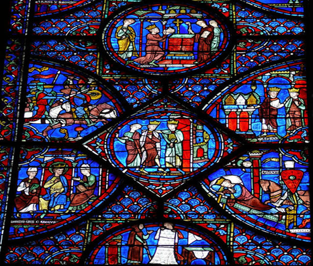 Vinduesmosaik (1200-tallet) fra katedralen i Chartes med mytologisk fortælling om Karl den Store som korsfarer: